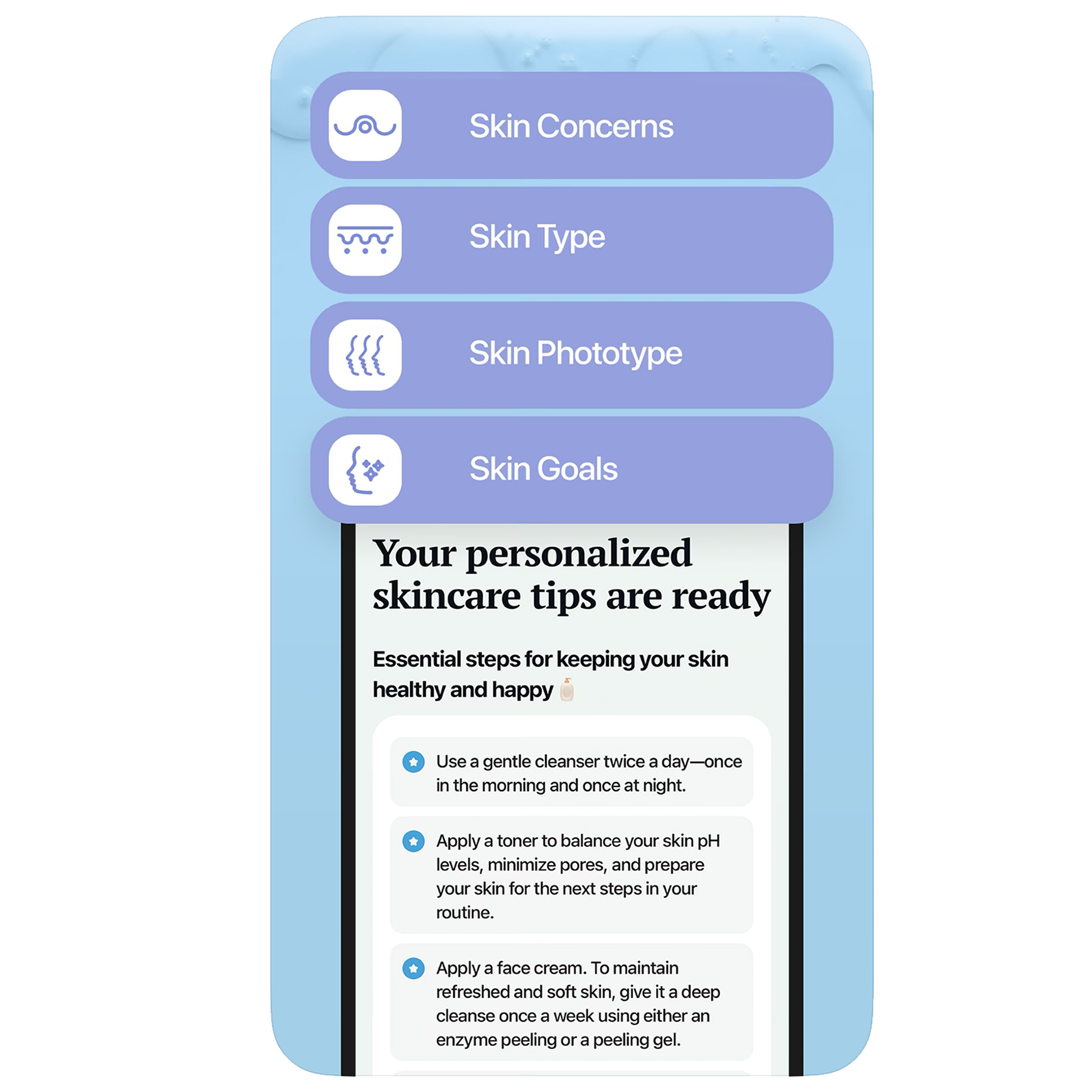 Based on your Skin Concerns, Skin Type, Skin phototype and your skin goals you can get personalised skincare tips. Isn't that amazing?